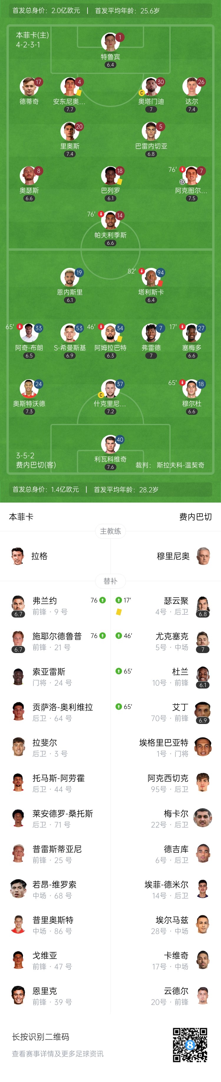 穆帅无缘欧冠!本菲卡1-0费内巴切晋级正赛 塔利斯卡两分钟吃两黄