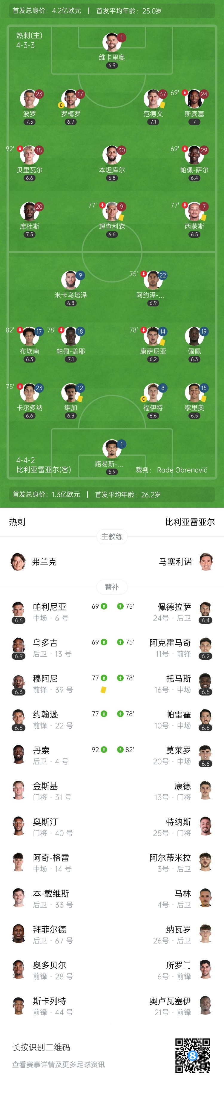 第65分钟,比利亚雷亚尔反击,哈维-西蒙斯犯规中断对手攻势。↓