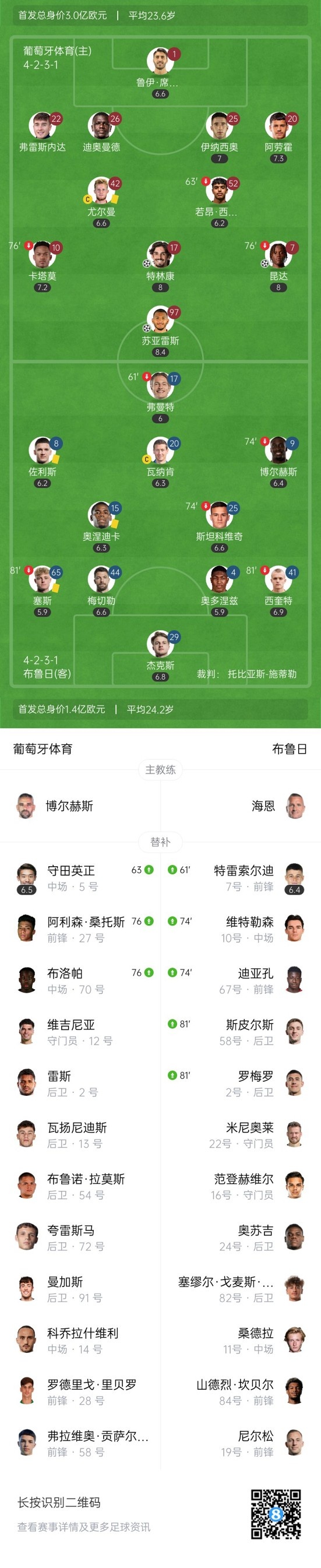 下半场补时4分钟,葡萄牙体育3-0布鲁日。