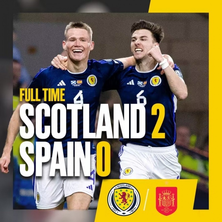 全场比赛结束,西班牙0-2苏格兰。
