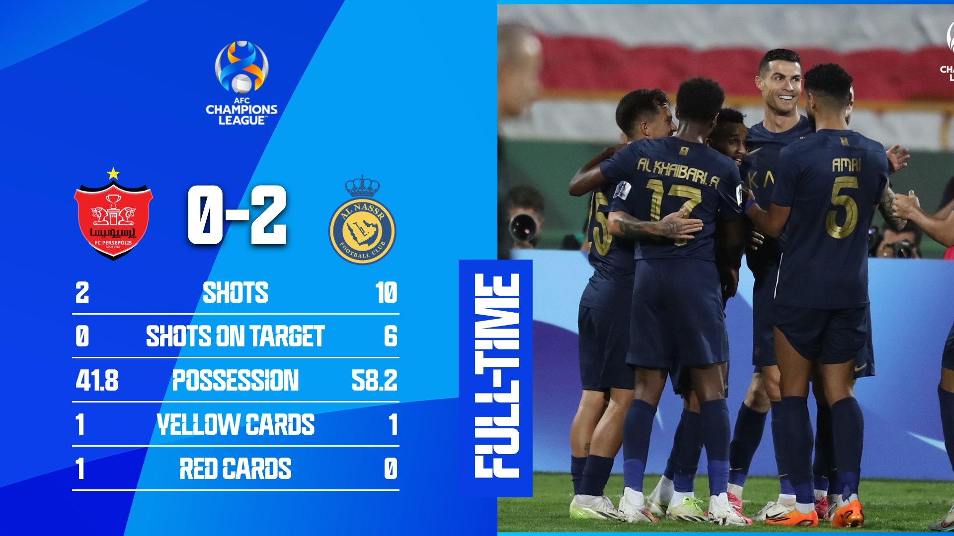 亚冠-利雅得胜利2-0十人波斯波利斯 加里卜传射B罗献助攻C罗策动