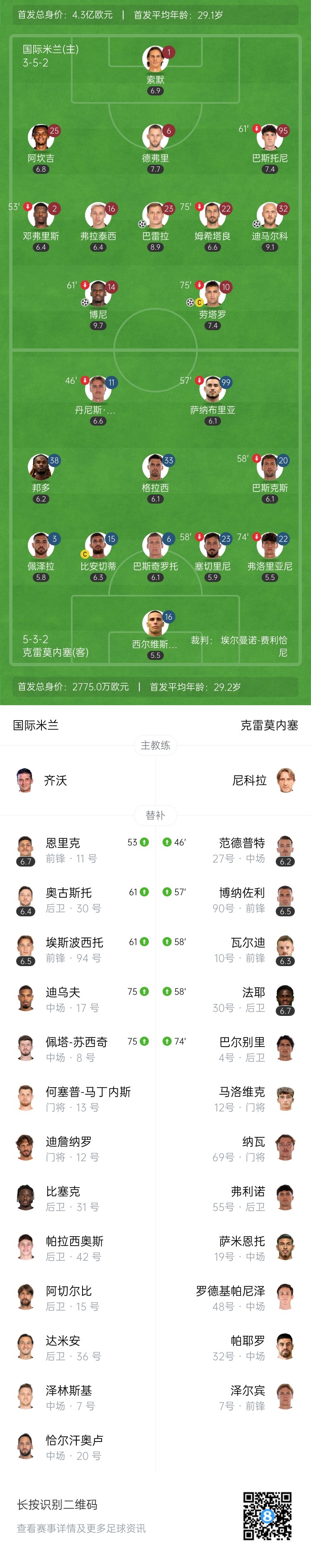 第57分钟,又是博尼的助攻!禁区前沿一脚小短传,巴雷拉得球直面门将推射破门!博尼1射3传独造4球!国际米兰4-0领先克雷莫内塞↓