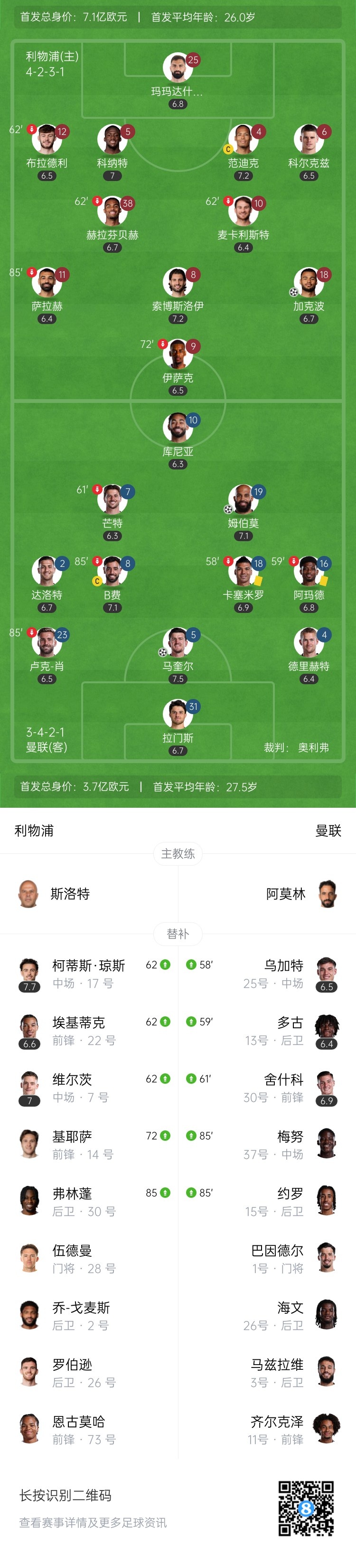 上半场伤停补时4分钟,半场结束,利物浦暂0-1曼联。