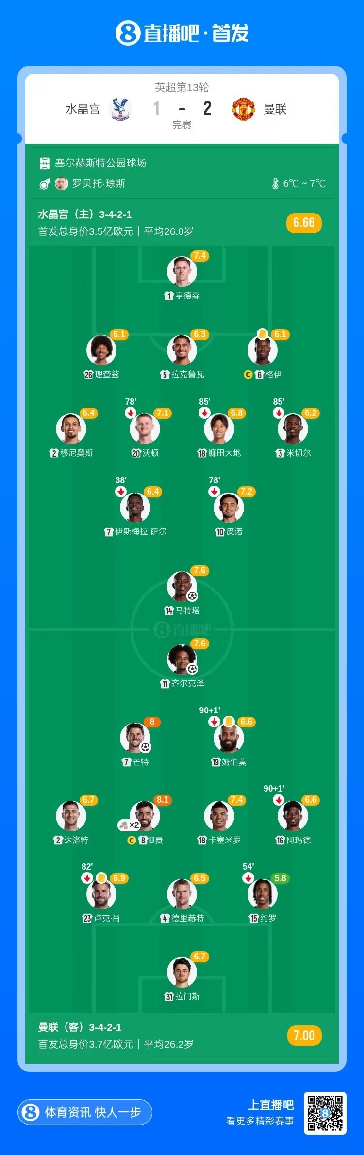11月30日讯 北京时间20:00,英超第13轮曼联客场挑战水晶宫,比赛在塞尔赫斯特公园球场打响!上半场,约罗送大礼,马特塔失良机;随后约罗铲倒马特塔送点,马特塔主罚点球破门,但被吹二次触球无效!重新主罚依然命中!半场补时,德里赫特滑倒送单刀,卢克·肖铲球封堵了恩凯提亚射门!下半场,B费任意球助攻,齐尔克泽0度角抽射破门!随后B费任意球再一拨,芒特远射破门反超!利桑德罗伤愈复出替补登场!最终,曼联客场2-1逆转水晶宫,终结英超3轮不胜!