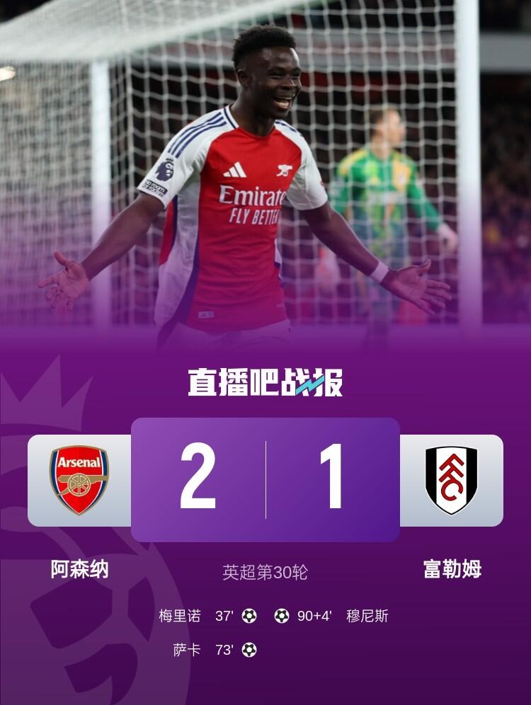 4月2日讯 北京时间4月2日凌晨2:45,2024-25赛季英超联赛第30轮,阿森纳坐镇酋长球场迎战富勒姆。上半场加布里埃尔伤退,梅里诺破门,阿森纳暂1-0富勒姆;下半场萨卡复出建功,穆尼斯为富勒姆扳回一球,最终阿森纳2-1富勒姆,英超两连胜,先赛情况下落后榜首9分。