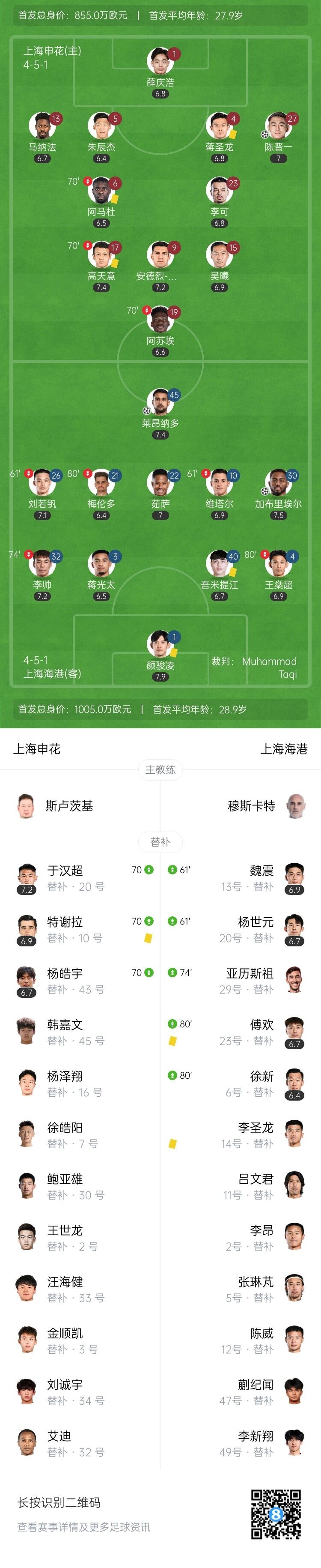 伤停补时13分钟。全场比赛结束,上海申花1-2上海海港。