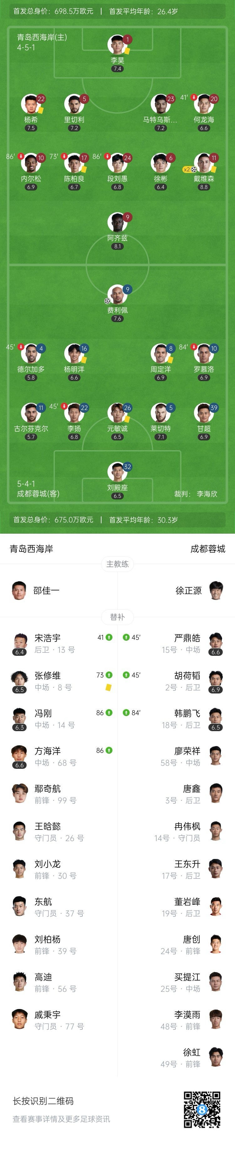 10月26日讯 北京时间10月26日18:30,中超第28轮,青岛西海岸坐镇西海岸大学城体育场迎战成都蓉城。上半场,德尔加多后场失误,阿齐兹助攻戴维森破门;下半场,西海岸再度抓住蓉城失误破门,阿齐兹助攻戴维森双响,费利佩双响+绝平。积分榜上,蓉城积59分仍居第二,落后海港1分,西海岸积37分排在第9位。