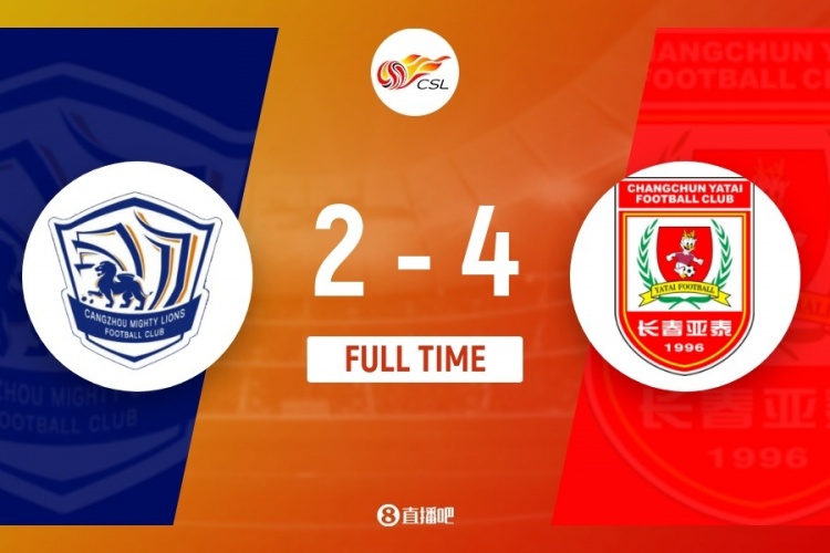 伤停补时4分钟。全场比赛结束, 沧州雄狮2-4长春亚泰。
