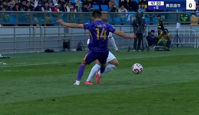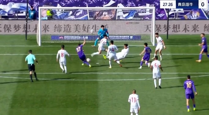第31分钟,青岛海牛禁区里一次头球攻门被门将飞身扑出底线。↓