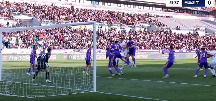 第51分钟,青岛右侧角球机会,禁区里的头球攻门顶高。↓