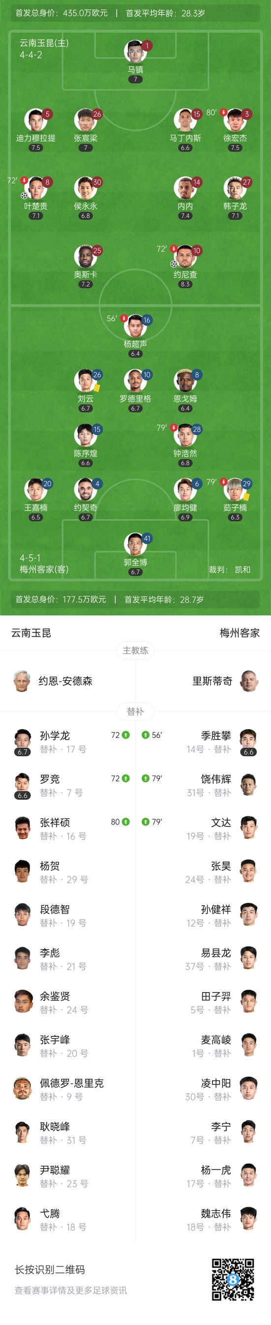 第18分钟,云南首开记录!反击机会内内后场长传球到右路约尼查到禁区连续内切低射破门,云南玉昆1-0梅州客家。↓