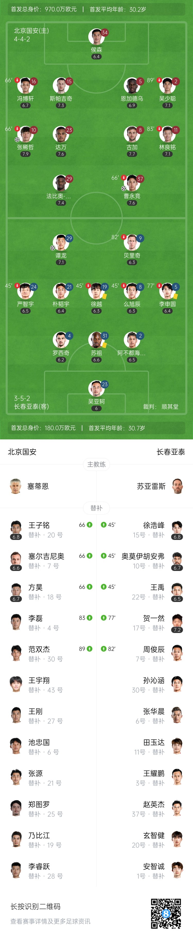 全场比赛结束,最终北京国安2-1长春亚泰。