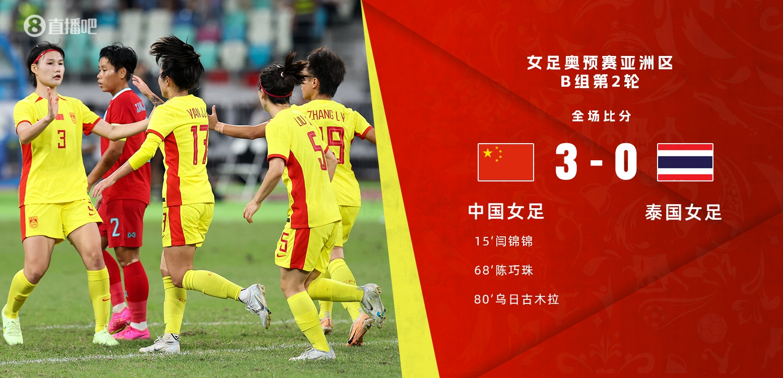 10月29日讯 北京时间10月29日19:35,奥运女足亚洲区预选赛B组第2轮,中国女足对阵泰国女足。上半场,中国女足占据绝对优势,陈巧珠助攻闫锦锦破门,刘艳秋抽射中柱;下半场,陈巧珠传中直接吊射飞进球网,乌日古木拉锦上添花。最终,中国女足3-0击败泰国,两战积3分暂列小组第三,球队末轮将对阵韩国女足,朝鲜女足和韩国女足积4分分居前两位。