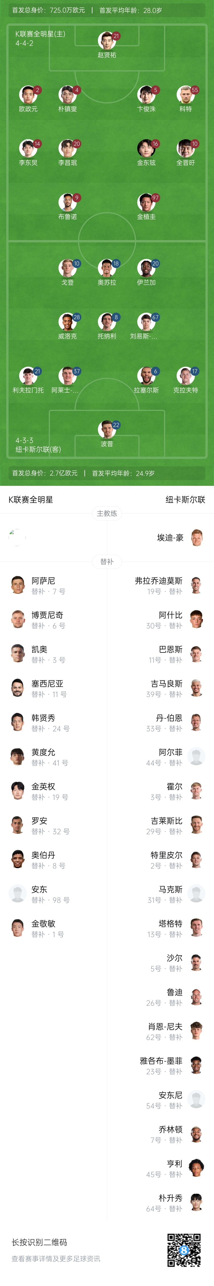 7月30日讯 足球友谊赛,K联赛全明星对阵纽卡斯尔联。上半场,纽卡方面半场0射正,控球率也落后,戈登开场失良机,金植圭破门。易边再战,奥苏拉失良机。最终纽卡0-1K联赛全明星。