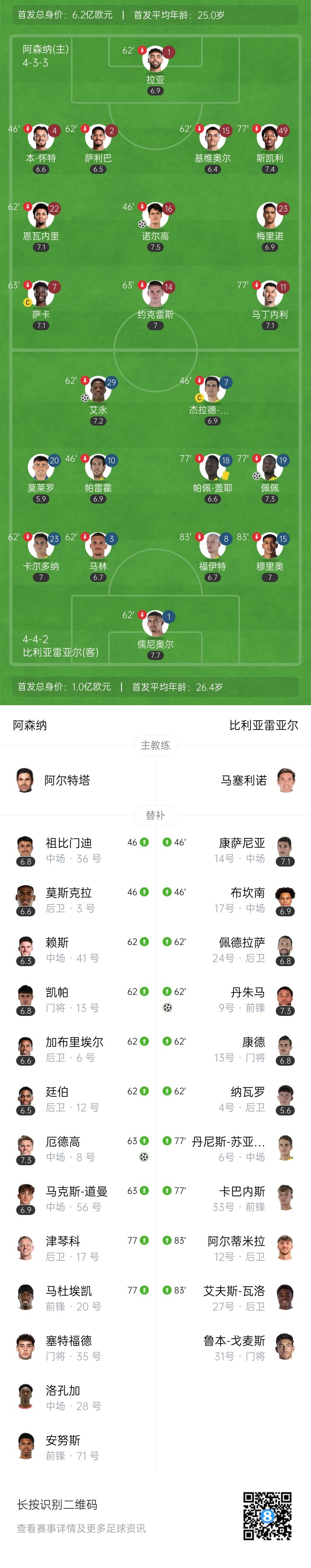 第36分钟,马丁内利开出角球,远端诺尔高无人盯防头球破门!阿森纳扳回一球1-2比利亚雷亚尔↓