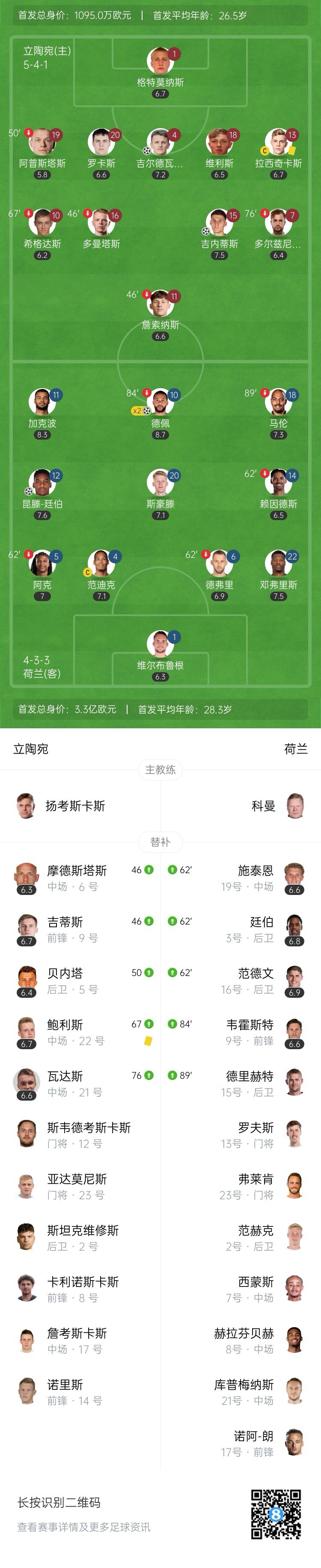 全场比赛结束,荷兰客场3-2战胜立陶宛。