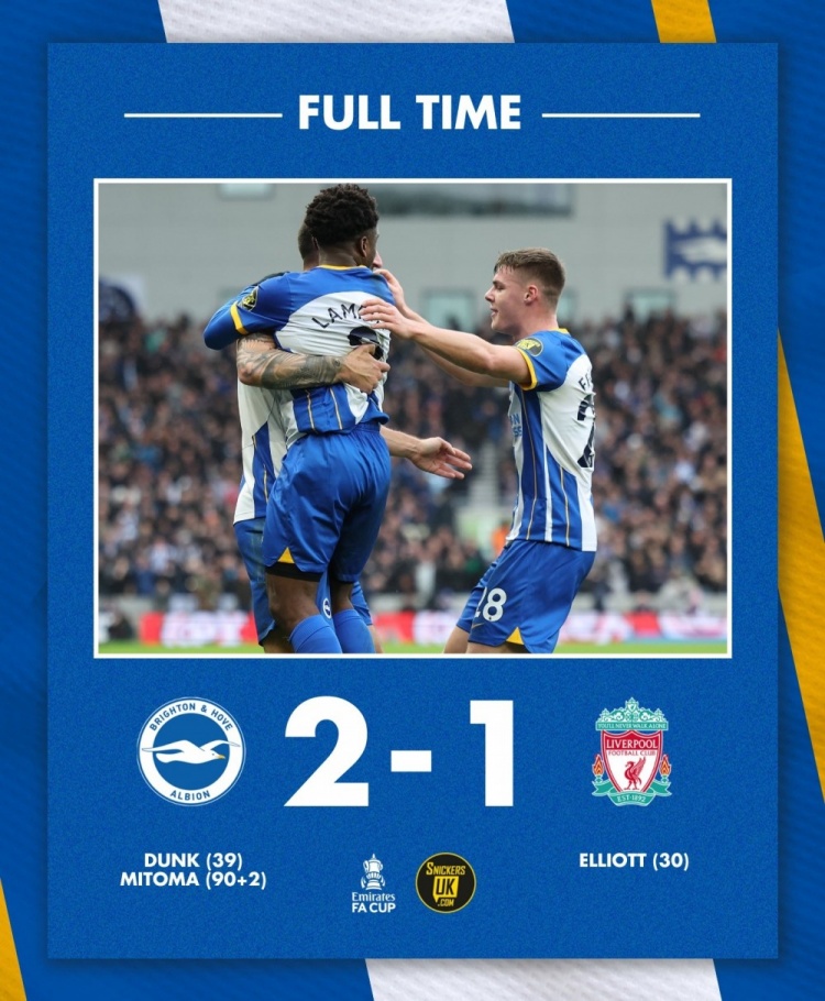 直播1月29日讯 北京时间1月29日晚上21:30,足总杯第4轮,布莱顿对阵利物浦。上半场,阿诺德门线救险,萨拉赫失单刀后助攻埃利奥特破门,邓克折射扳平。下半场,三笘薰屡造威胁后补时绝杀。全场结束,布莱顿2-1利物浦,顺利晋级下一轮。