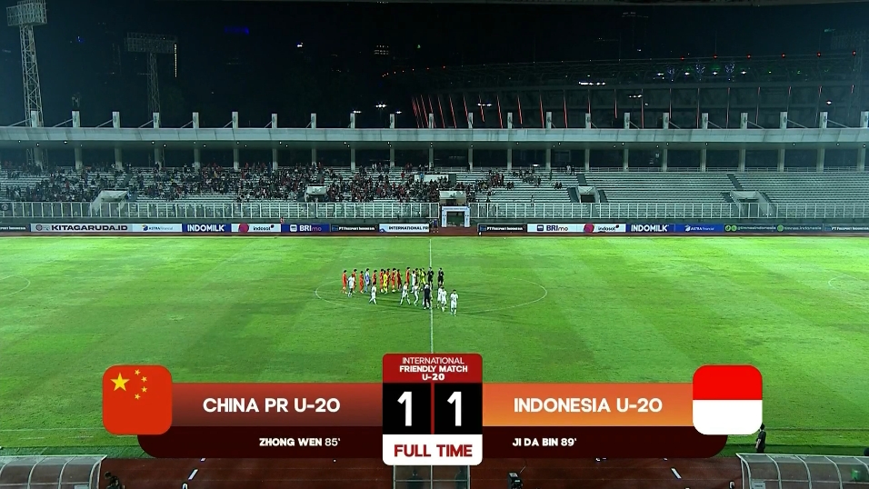 全场比赛结束,U19国青1-1印尼国青。