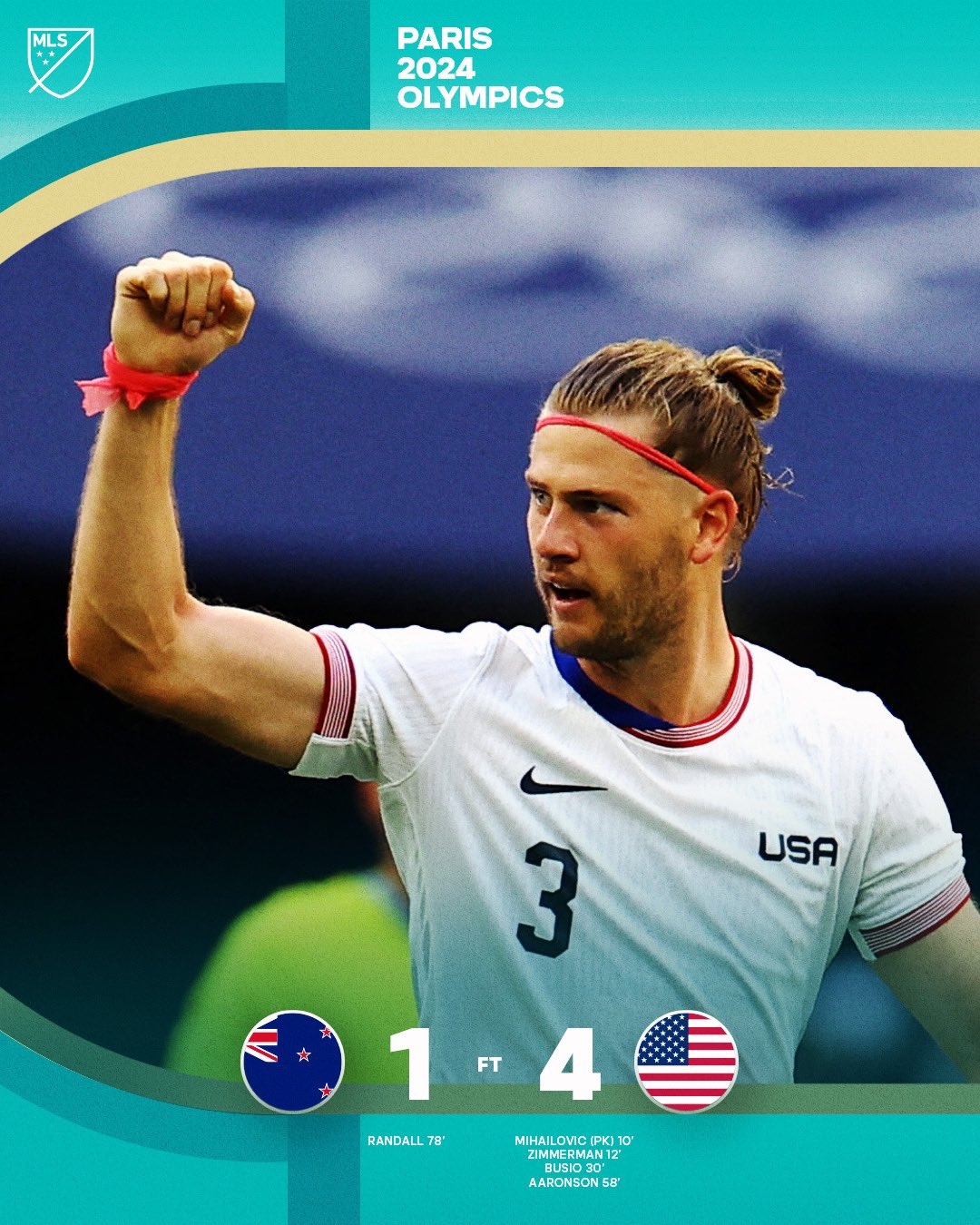 奥运男足-美国4-1大胜新西兰,美国净胜球优势暂升第二