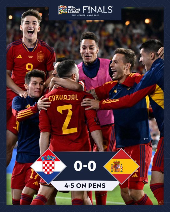 6月19日讯 北京时间6月19日凌晨2点45分,2022-23赛季欧国联决赛在费耶诺德球场展开角逐,克罗地亚对阵西班牙。上半场克拉马里奇失良机,下半场法蒂错失绝杀良机,加时赛双方均无建树,120分钟内双方0-0战平。最终点球大战乌奈-西蒙两扑点,西班牙总比分5-4战胜克罗地亚夺冠。西班牙成为法国后第二支,夺得欧洲杯、世界杯和欧国联的三冠王球队。
