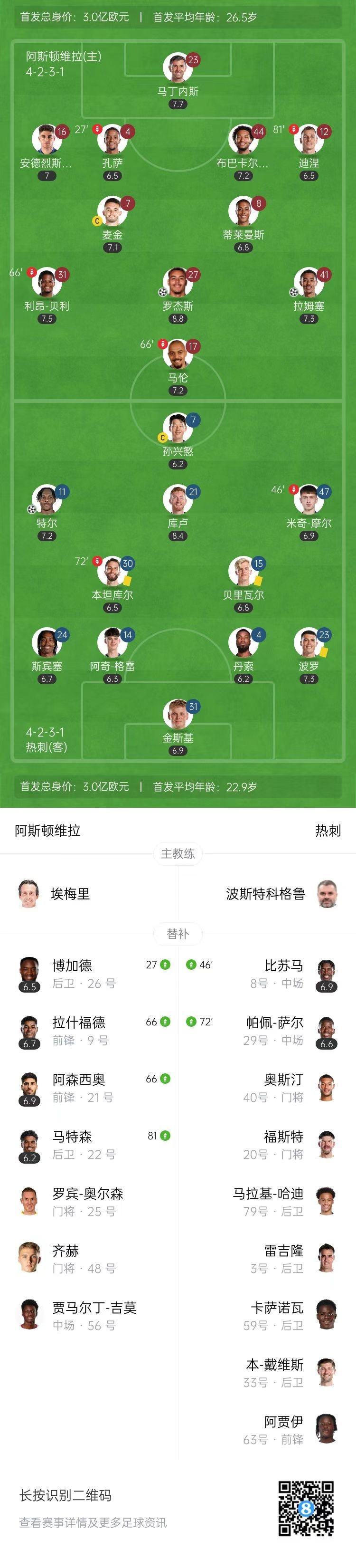 2月10日讯 北京时间2月10日1:35,足总杯第4轮,阿斯顿维拉坐镇维拉公园球场迎战热刺。上半场,拉姆塞为维拉取得梦幻开局,孙兴慜近距离打门被马丁内斯扑出。下半场,拉姆塞错失单刀,罗杰斯补射空门扩大比分,特尔抢点扳回一城。最终,维拉主场2-1击败热刺,晋级足总杯16强。