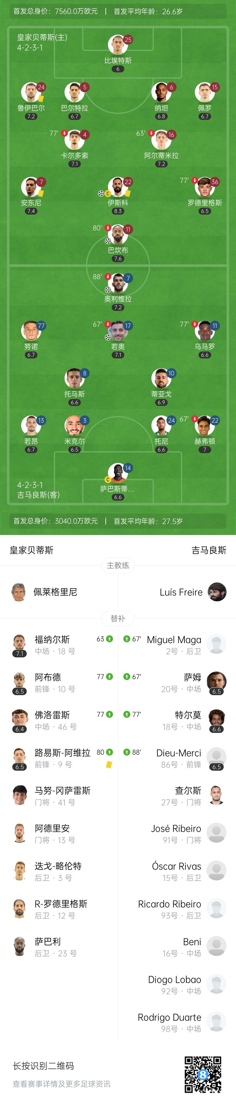 全场比赛结束,皇家贝蒂斯首回合主场2-2战平吉马良斯。