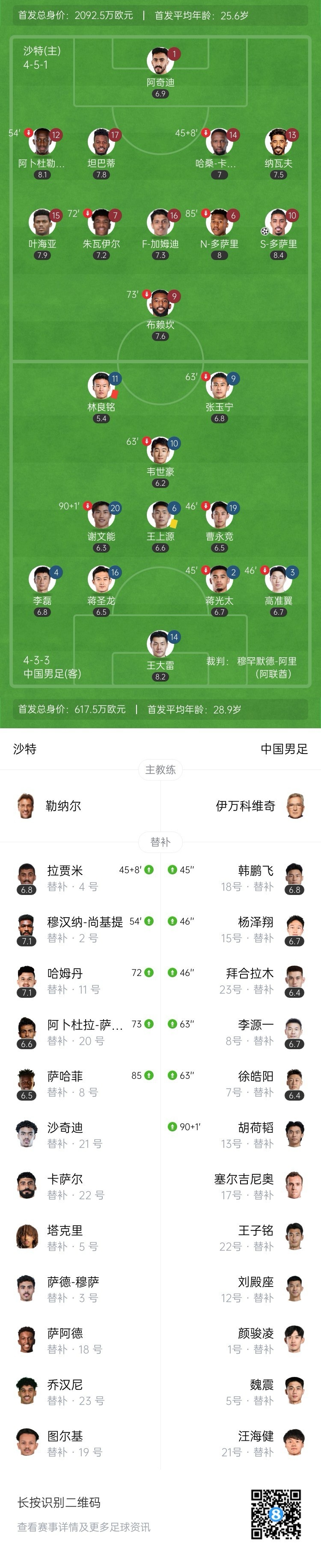 3月21日讯 北京时间3月21日凌晨2时15分,世预赛亚洲区第三阶段C组第7轮在沙特国王大学体育场展开角逐,中国男足客场对阵沙特。上半场王上源染黄下轮将停赛,纳瓦夫中框,加姆迪进球手球无效,蒋光太伤退,林良铭补时直红,下半场多萨里破门,塞尔吉尼奥无缘首秀。最终十人国足0-1遭沙特双杀,国足全场0射正,下轮将主场迎战澳大利亚。积分榜方面,国足两连败积6分负11净胜球垫底,沙特积9分位居第3名。