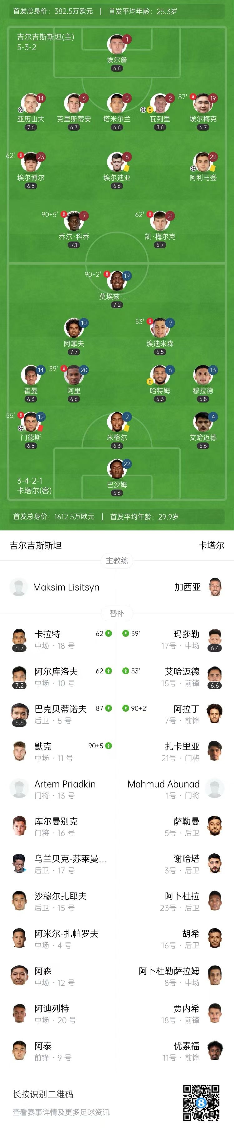 3月25日讯 北京时间3月25日21:45,世预赛亚洲区第三阶段A组第8轮,吉尔吉斯斯坦坐镇比什凯克斯巴达克体育场迎战卡塔尔。上半场,瓦列里任意球直接破门助吉尔吉斯斯坦领先。下半场,阿菲夫角球助攻艾哈迈德头球破门,门德斯铲球危险动作染红,亚历山大世界波破门再度超出比分,阿利马登禁区破门锁定胜局。最终,卡塔尔客场1-3不敌吉尔吉斯斯坦,8轮过后仍积10分位列第4,吉尔吉斯斯坦取得第2胜,积6分排在第5位。
