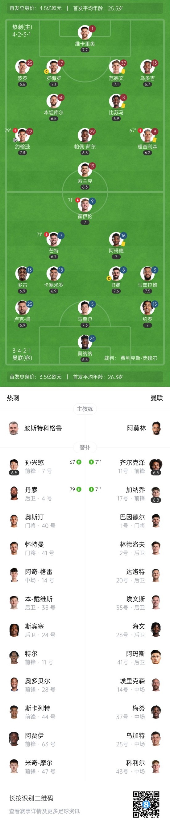 下半场补时7分钟,热刺1-0曼联。