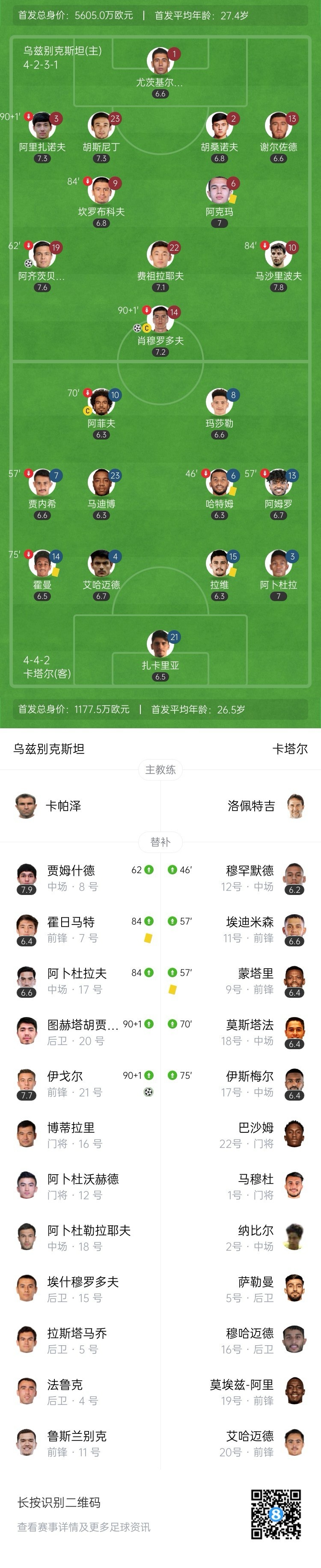 全场比赛结束,乌兹别克斯坦3-0击败卡塔尔。